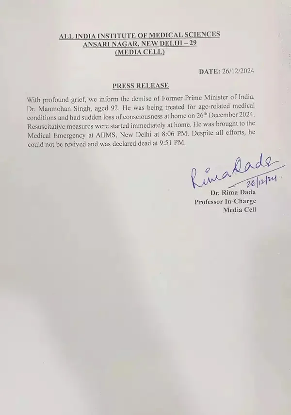 এক বিবৃতিতে এআইআইএমএস বলেছে, কংগ্রেসের প্রবীণ নেতা মনমোহন সিংকে বয়সজনিত অসুস্থতার কারণে অল ইন্ডিয়া ইনস্টিটিউট অব মেডিক্যাল সায়েন্সেসে ভর্তি করা হয়েছিল। বৃহস্পতিবার হঠাৎ করেই নিজ বাড়িতে চেতনা হারিয়ে ফেলেছিলেন তিনি। হাসপাতালে আনার পর চিকিৎসকদের সকল প্রচেষ্টা সত্ত্বেও তার চেতনা ফেরানো যায়নি। হাসপাতালের চিকিৎসকরা রাত ৯ টা ৫১মিনিটে তাকে মৃত ঘোষণা করেন।