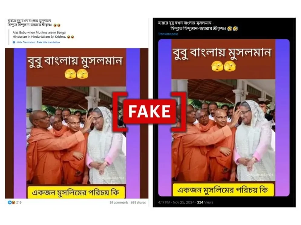 ছবিটির ফ্যাক্ট চেক করে দেখা যায়, শেখ হাসিনার হিন্দু ধর্ম গ্রহণের দাবিতে ভাইরাল ছবিটি এডিট করা হয়েছে। এই ছবির মূল ছবিটি ২০২২ সালের সেপ্টেম্বর মাসের। যেখানে ভারতের বিরোধী রাজনৈতিক দল কংগ্রেসের নেতা রাহুল গান্ধীর কেরালা সফরের সময় তার কপালে তিলক এঁকে দেন হিন্দু পুরোহিত। সেই ছবি এডিট করে রাহুল গান্ধীর জায়গায় শেখ হাসিনাকে বসানো হয়েছে।