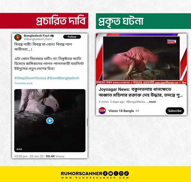 রিউমর স্ক্যানারের প্রতিবেদনে বলা হয়, বিষয়টি নিয়ে অধিকতর অনুসন্ধান করা হয়। এই অনুসন্ধানে ‘ভিশন এইটিন বাংলা’ নামের একটি ইউটিউব চ্যানেলে একটি ভিডিও খুঁজে পাওয়া যায়। ২৪ জানুয়ারি প্রকাশিত ভিডিওটির শিরোনাম: ‘জয়নগর নিউজ: বকুলতলায় ধানক্ষেতে অজ্ঞাত মহিলার রক্তাক্ত দেহ উদ্ধার, তদন্তে পুলিশ’। এই ভিডিওটির সঙ্গে আলোচিত ভিডিওটির বিষয় ও পারিপার্শ্বিকতার মিল রয়েছে।