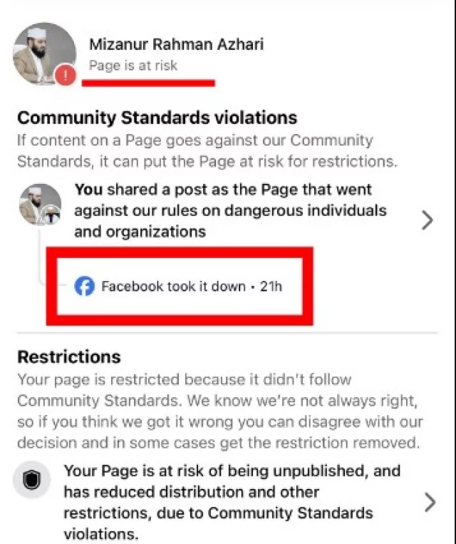 জনপ্রিয় ইসলামী বক্তা মাওলানা ড. মিজানুর রহমান আজহারী জানিয়েছেন, নতুন করে রেস্ট্রিকশনে পড়েছে তার ফেসবুক পেইজ! রিচ ডাউন করে দেওয়া হয়েছে।