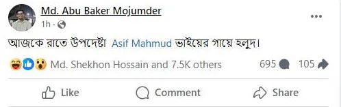 বিয়ে নিয়ে করা সমন্বয়ক বাকেরের মন্তব্যের প্রতিক্রিয়ায় স্ট্যাটাসটির মন্তব্যের ঘরে উপদেষ্টা আসিফ মাহমুদ লেখেন, সাইবার সিকিউরিটি অ্যাক্টে মামলা করা হবে সংঘবদ্ধ গুজব ছড়ানোর দায়ে।