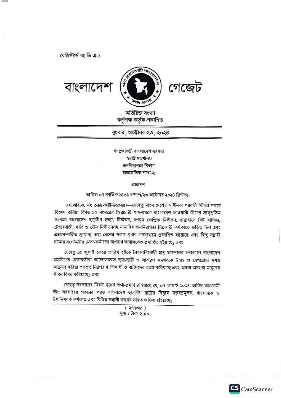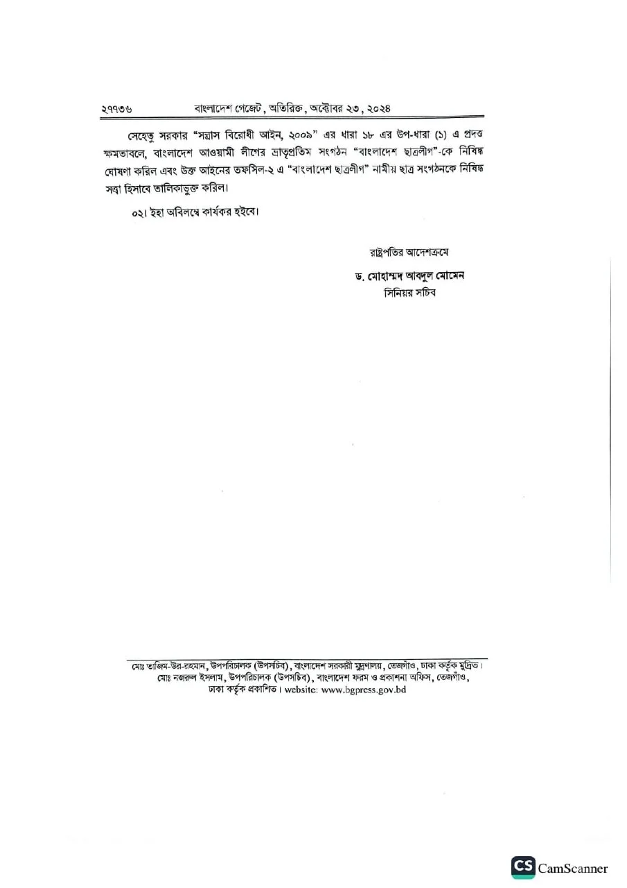 এই অবস্থায় সরকার ‘সন্ত্রাস বিরোধী আইন, ২০০৯’ এর ধারা ১৮ এর উপ-ধারা (১) এ প্রদত্ত ক্ষমতাবলে বাংলাদেশ আওয়ামী লীগের ভ্রাতৃপ্রতিম সংগঠন ‘বাংলাদেশ ছাত্রলীগ’কে নিষিদ্ধ ঘোষণা করল এবং ওই আইনের তফসিল-২ এ ‘বাংলাদেশ ছাত্রলীগ’ নামীয় ছাত্র সংগঠনকে নিষিদ্ধ সত্ত্বা হিসেবে তালিকাভুক্ত করল বলে প্রজ্ঞাপনে উল্লেখ করা হয়।