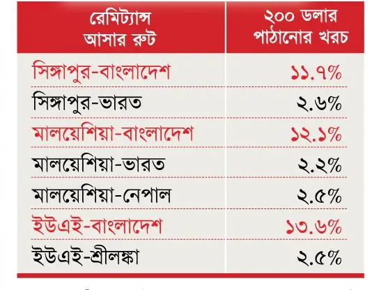 গত বছর ভারতের প্রবাসীদের এ রুটে ২০০ ডলার পাঠাতে খরচ হয়েছে মাত্র দুই দশমিক ৬ শতাংশ তথা পাঁচ দশমিক ২ ডলার। অর্থাৎ সিঙ্গাপুর থেকে ভারতের তুলনায় বাংলাদেশে রেমিট্যান্স পাঠাতে সাড়ে চারগুণ বেশি ব্যয় হচ্ছে।