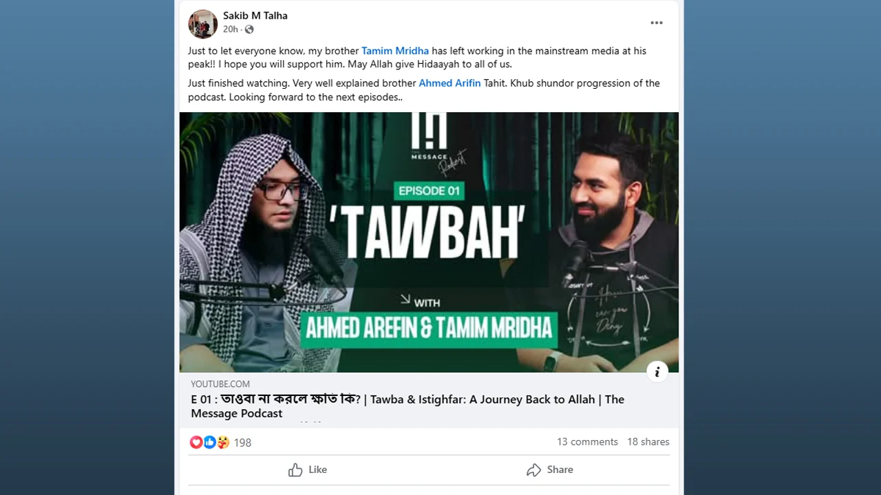 তামিমের বড় ভাই সাকিব এম তালহা সামাজিক যোগাযোগ মাধ্যমে এক পোস্ট দিয়ে বিষয়টি নিশ্চিত করেছেন। তালহা লিখেছেন, ‘আমার ভাই তামিম মৃধা মূলধারার মিডিয়াতে কাজ করা ছেড়ে দিয়েছেন।