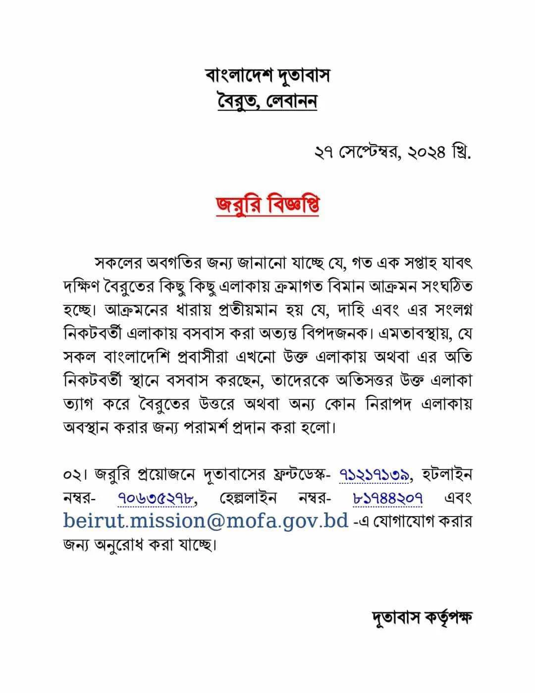 এতে বলা হয়, গত এক সপ্তাহ ধরে দক্ষিণ বৈরুতের কিছু কিছু এলাকায় ক্রমাগত বিমান আক্রমণ চলছে। আক্রমণ দেখে বোঝা যাচ্ছে, দাহি এবং এর নিকটবর্তী এলাকায় বসবাস করা অত্যন্ত বিপজ্জনক। এ অবস্থায় যেসব বাংলাদেশি প্রবাসী এখনও ওইসব এলাকায় বসবাস করছেন, তাদের দ্রুত ওই এলাকা ত্যাগ করতে হবে। বৈরুতের উত্তরে অথবা অন্য কোনো নিরাপদ এলাকায় তাদের অবস্থান করার জন্য পরামর্শ দেওয়া হলো।