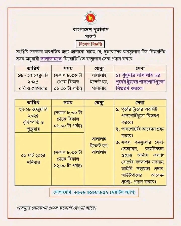 ওমানের সালালায় বসবাসরত প্রবাসীদের যাবতীয় কনস্যুলার সেবা দিতে অঞ্চলটিতে যাচ্ছে দূতাবাসের একটি ভ্রাম্যমাণ টিম।